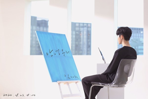 이어 세 번째 포토에는 파랗게 칠해진 캔버스 앞에 앉아 있는 김재환의 뒷모습이 ‘안녕 못 해’ 곡 분위기를 예상케 했다.